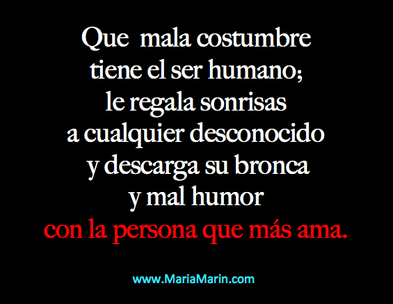 ¡Qué cierto lo que dice la frase! ¿verdad? ¡Qué mala costumbre tenemos las personas y qué irracional es este asunto! ¿Y porqué hacemos ésto?, ¿porqué tratamos mejor a cualquier desconocido que a las personas que nos quieren, nos aguantan, nos regalan su cariño y nos prestan su hombro cuando lo necesitamos? ¿Qué es lo que hace que seamos tan injustos?