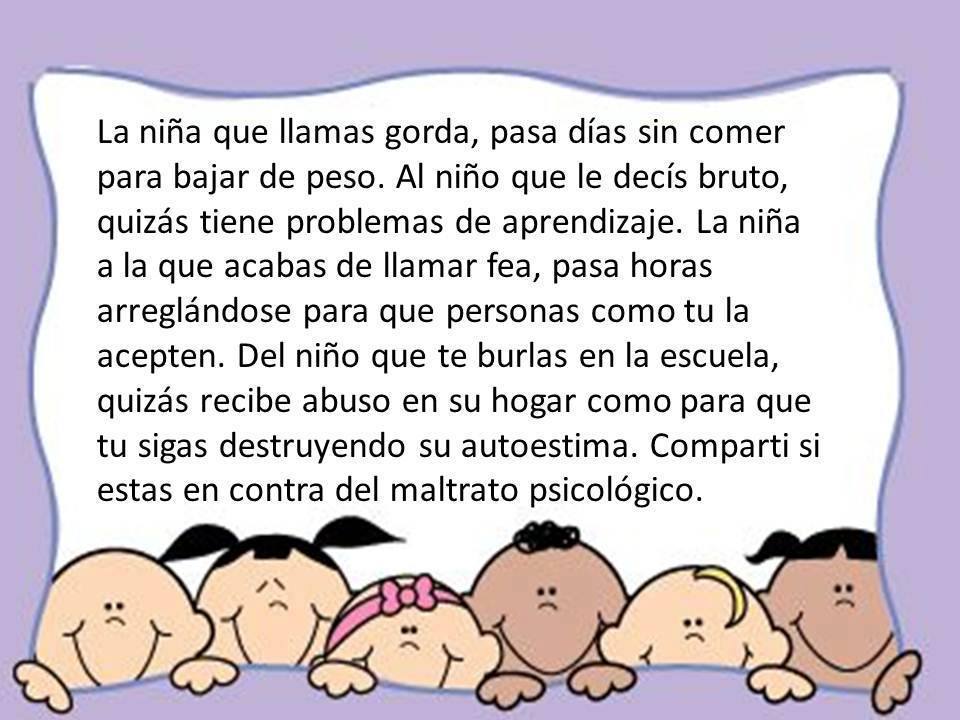 Somos insensibles, intransigentes y demasiado exigentes con nuestros pequeños. Es para barrernos de la tierra por inadecuados, torpes y malos… no hay justificación posible para llamar a un niño gordo, bruto, feo, o burlarte de él/ella porque no alcanzan nuestras absurdas expectativas, que si lo pensáis, no sirven para nada. No sabemos empatizar y pensar lo que pueden sentir y lo que va a afectarles cuando sean adultos. No pensamos en el esfuerzo que todos los niños hacen para agradar a los mayores, para ser aceptados, para que se les quiera y considere niños normales. ¡Es tan terrible el ejemplo que tienen!