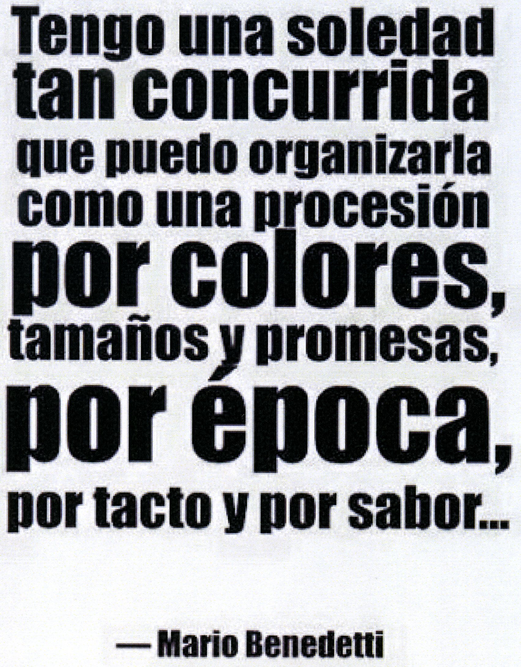 Nuestra soledad es concurrida, es vivir con respeto y cariño hacia nuestro «yo», es llenarla de tantas cosas que nos gustan, que podemos organizarlas, como dice Mario Benedetti, por colores, tamaños, y promesas, por época, por tacto y por sabor…..¿maravilloso verdad? Esta es la soledad sana, la que hay que buscar por todos los medios y no dejar escapar y en la que integramos sin problema a esa persona especial, siempre que entre en ella sin esfuerzo, sin sacrificios, sin promesas….solo que entre. De esa forma, claro que dejo pasar a alguien, de otra, no. No me compensa.