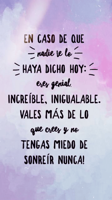 Hola a todos. Por fin vuelvo a tener ganas… y aunque un poco llena de «cosas» como siempre, me apetece e intentaré encontrar un huequillo para divagar con vosotros. Espero que la frase elegida hoy sirva para que, os lo creáis o no, afirméis que sois geniales, increíbles, inigualables y que valéis mucho más de lo que creéis. Es una bienvenida para que lo afirméis, lo interioricéis y no tengáis nunca miedo de creerlo. Ésto que algunos llaman el rollo de ser positivo, para mí es ser valiente y empeñarnos en engañar a nuestros miedos internos para que se comporten adecuadamente, no salgan cuando no se les llama y nos dejen en paz hasta que los necesitemos (porque a veces son necesarios).